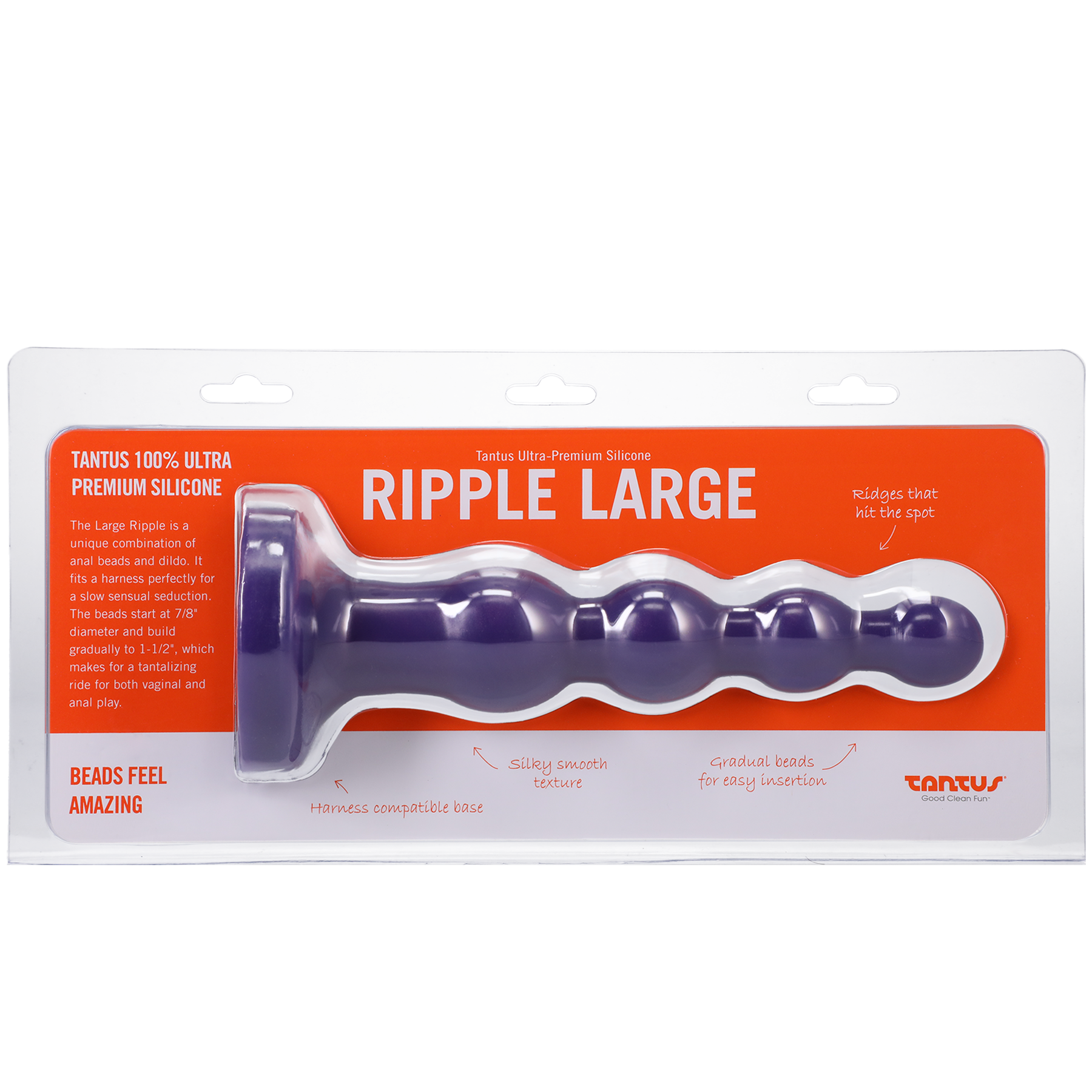 Tantus Silicone Large Ripple Butt Plug, The Large Ripple by Tantus is a combination of anal beads/dildo. It fits a harness perfectly for a slow sensual seduction. The beads start at 7/8 in. diameter and build gradually to 1.5, which makes for a tantalizing ride for both vaginal and anal play.